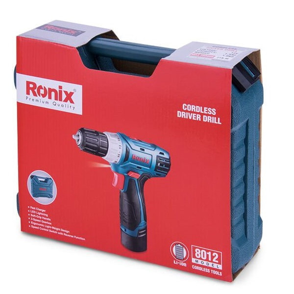 دریل پیچ گوشتی شارژی رونیکس مدل 8012 محصول جدید شرکت رونیکس می باشد که مجهز به گیربکس دو دور صنعتی چهت افزایش اثر بخشی کارکرد با دو عملکرد در پیچ کاری و سوراخکاری است و این گیربکس دو سرعته این امکان را فراهم می کند تا سه نظام در دو حالت مختلف به گردش در آید. در حالت اول سرعت گردش سه نظام از صفر تا 400 و در حالت دوم از صفر تا 1350 دور در دقیقه قابل کنترل توسط کاربر می باشد. دریل پیچ گوشتی روینکس مدل 8012 دارای باطری لیتیومی 1.5 آمپر با عمر طولانی و قدرت شارژ سریع باطری است که این باطری در زمان 1.5 ساعت شارژ می شود. دریل پیچ گوشتی رونیکس مجهز به چراغ LED جهت کار در محیط های کم نور و تاریک می باشد که امکان دید بهتر و کار راحتتر را برای کاربر امکان پذیر می کند. به همراه دریل شارژی رونیکس مدل 8012 دو عدد باطری و شارژر مجهز به سیستم شارژر سریع و قطع کن هوشمند و کیف BMC مقاوم در برابر ضربه عرضه میگردد. همچنین دارای گارانتی شرکت رونیکس می باشد.